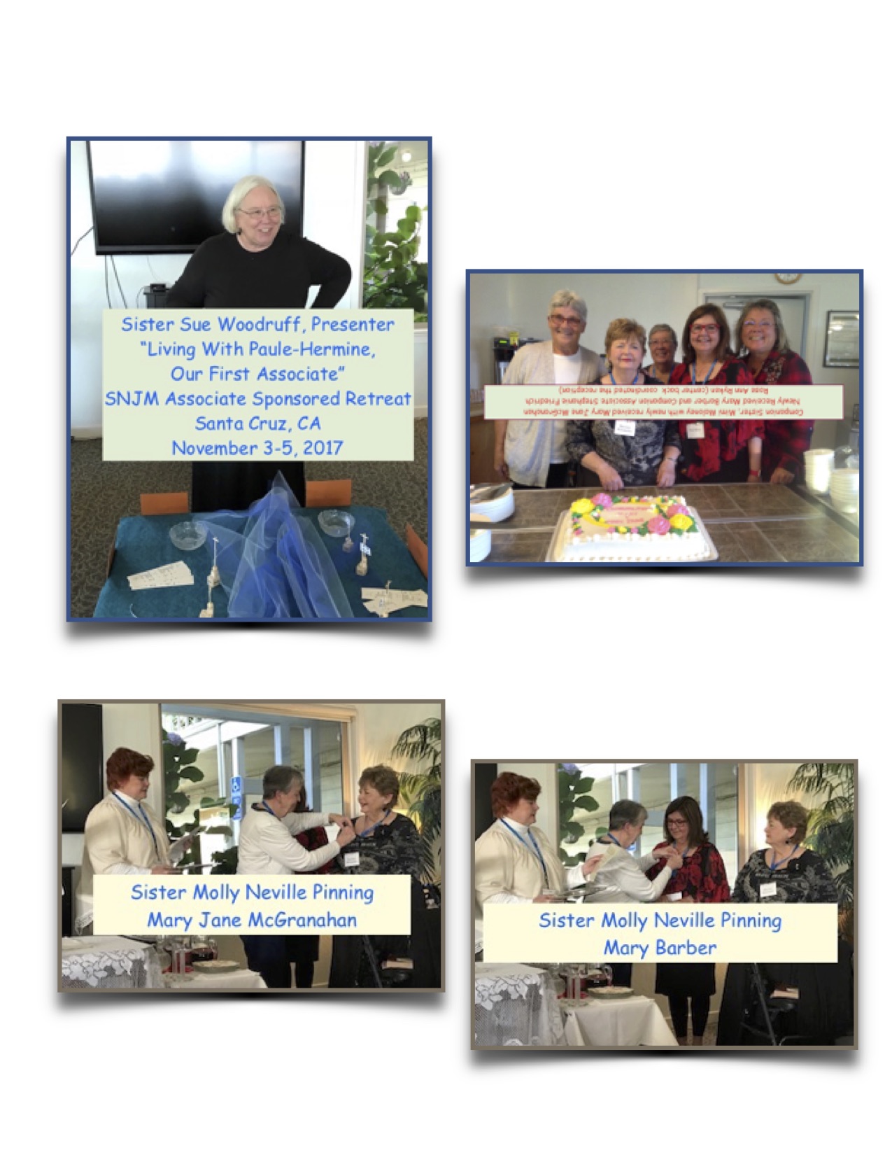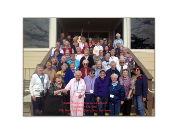 Villa Maria del Mar, Santa Cruz, CA November 3-5, 2017 Many celebrations took place at the Villa Maria del Mar in Santa Cruz, California for Sisters and Associates this past weekend. The annual Associate Sponsored Retreat was held November 3rd through 5th. We had a full house. The topic was Living With Paule-Hermine, Our First Associate. Sue Woodruff, SNJM was our presenter. Sister Sue is a historian for our SNJM community. She is a brilliant presenter and we hung on her every word. On November 4th we received two new Associates, Mary Barber and Mary Jane McGranahan. Mary was presented by her companion Associate, Stephanie Friedrich. Mary Jane was presented by her companion Sister, Mimi Maloney, SNJM. Mary and Mary Jane’s families and friends joined us in celebrating our reception of these wonderful women. We are blessed and our tent is widening.
