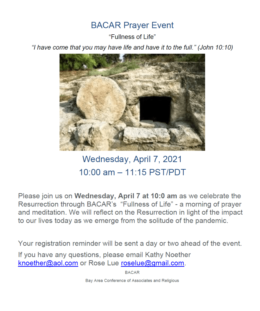 BACAR, Inc. Bay Area Conference of Associates, Affiliates, Religious and Friends, Inc. Eco-spirituality: Transformation of Mind, Heart, and Will Laudato Si: On Care for Our Common Home March 1, 2023 – Sister Carol Zinn, CSF “The Lord God formed humanity out of the clay of the ground and blew the breath of life into the… Continue reading March 1, 2023 – Zoom